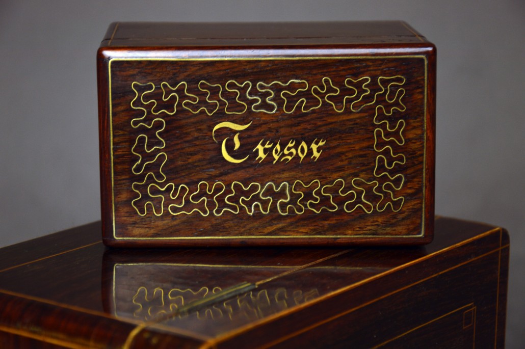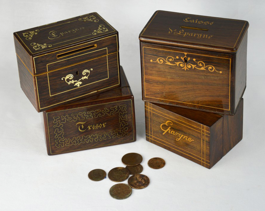 同様に、19世紀のブルジョア男性の本質を成す価値観である「富」と「貯蓄」が重要視されていたことは、特に貯金箱の普及に顕著に表れています。1818年にBenjamin Delessert(バンジャマン・ドゥルセール)とFrançois de la Rochefoucaud-Liancourt(フランソワ・ド・ラ・ロシュフーコー・リアンクール)が初の貯蓄銀行、かの有名なCaisse d’Epargne(ケス・デパーニュ)を設立したとき、彼らの目的は何よりも慈善的なものでした。つまり、ナポレオン帝国崩壊後の経済危機の時代に、慎重な資金の運用と貯蓄の利点について人々を教育することを目指していたのです。当然のことながら、この銀行の名前は非常に有名となり、小箱には「ケス・デパーニュ」「貯金」「金庫」などの文字が象嵌されるほどでした。これらの小箱は、持ち主に貯蓄の価値の重要性を思い出させてくれていたのです。