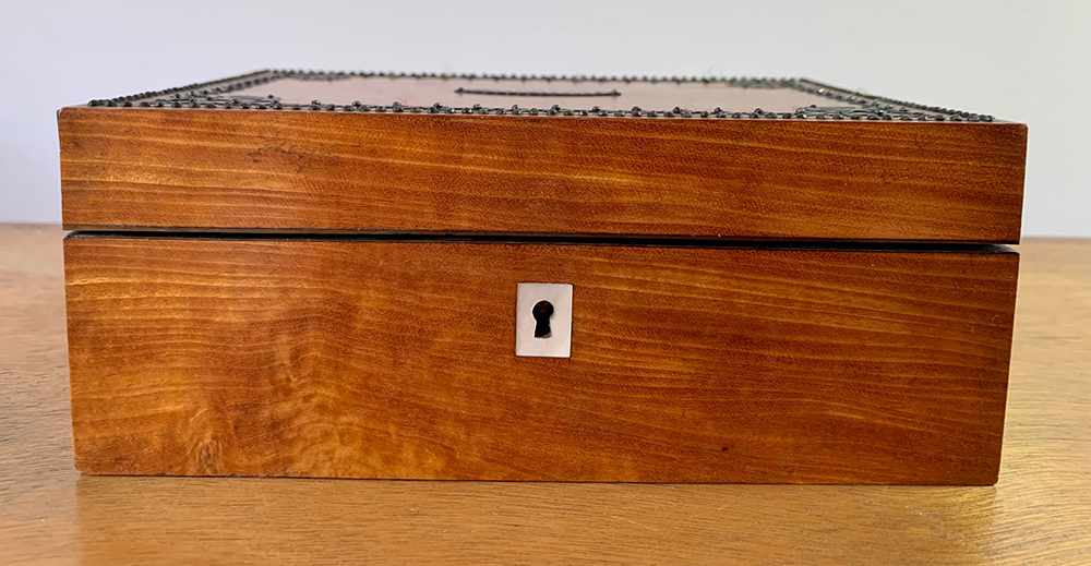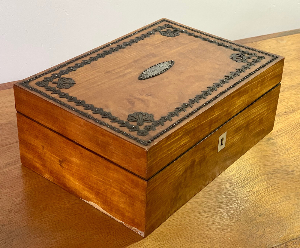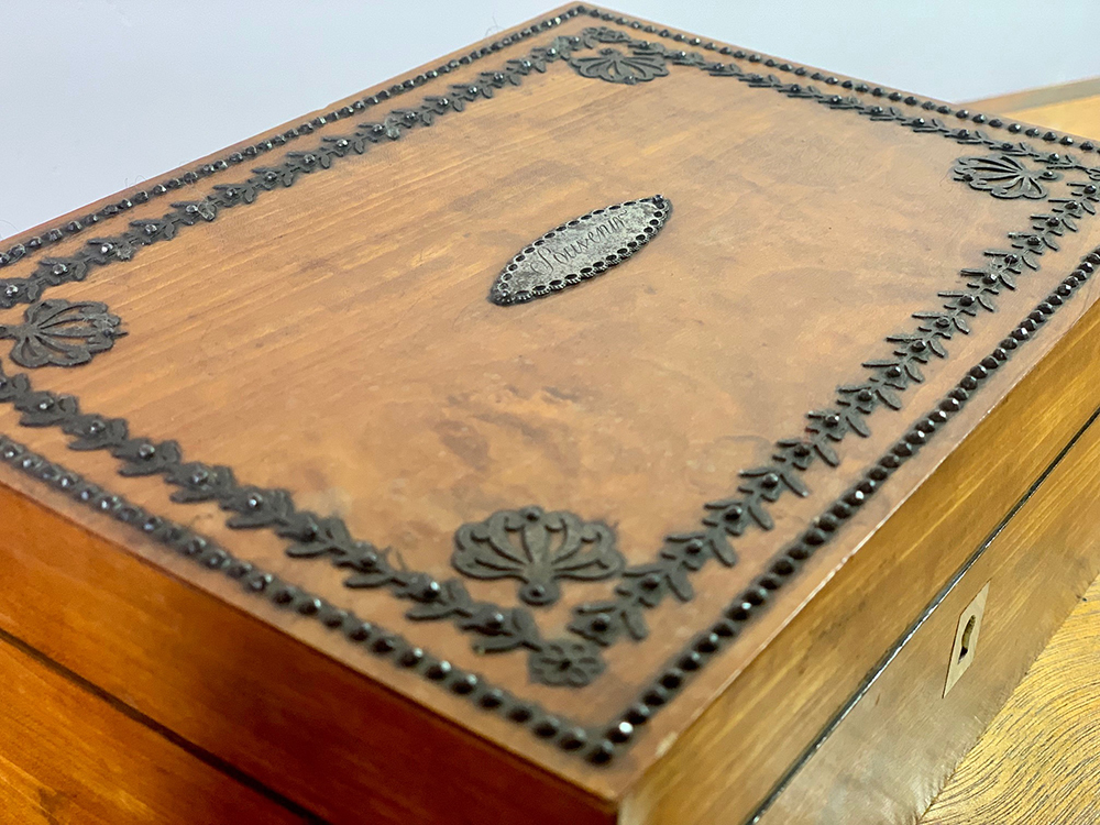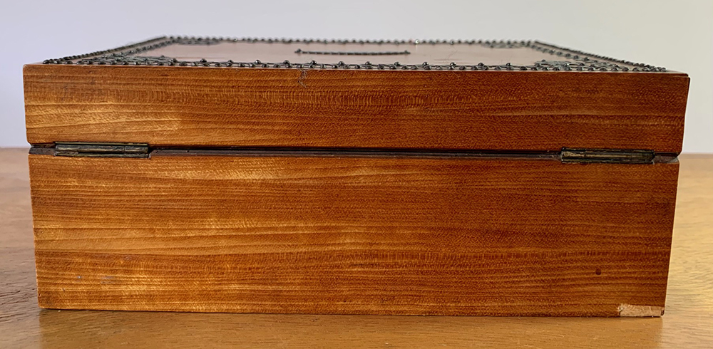 | 材質 | レモンの木の化粧板、ダイヤモンドポイントの鋼鋲による装飾、内部はグリーン色の布地張り(後張り)、錠部分周りに白蝶貝 |