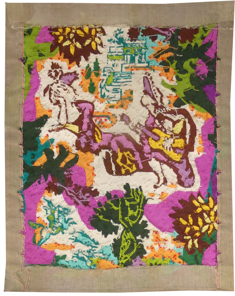 「タピスリーへの愛に基づいて絵を描いてきた私が、自分の絵に忠実なタピスリーを制作することは、比較的容易であり、とても魅力的な作業であったことを、もはやご理解いただけるだろう」と、1970年にGalerie Verrière(ヴェリエール画廊)で開催された展覧会のカタログでシャルル・ラピックは語っています。彼が下絵を制作し始めたのはわずか9年前の1961年からで(50点以上)、織物のタピスリー向けだけでなく[オービュッソンのみならず、モビリエ・ナショナル(フランス国有動産管理局)のために、時にはタピスリー作家ピエール・ボードゥアンの協力を得て制作]、刺繍のタピスリーに向けた作品もありました。これらの下絵には、原色で構成されたラピックの非常に大胆な色使いが反映されています。また、本作品の場合、強烈なピンク色をベースとして、前景の演奏会と後景の狩猟の場面とにストーリーが分散されています。
